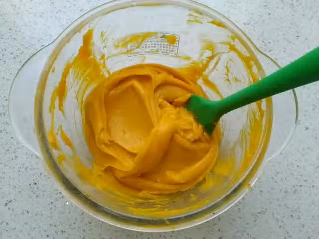 準備好五個雞蛋,蛋黃和蛋白都是要分開的,在蛋黃裡面加入放涼之後的紅薯南瓜泥,還要加手續的玉米油。