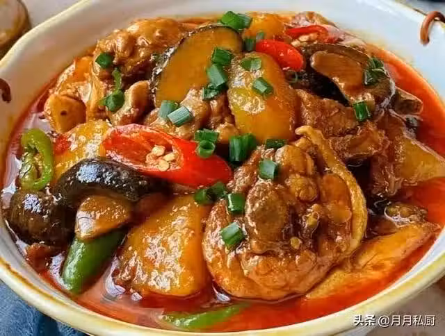 5.再放入土豆,加食鹽和白糖調味,中火慢燉20分鐘至土豆軟爛,湯汁不多的時候加入青紅椒翻炒幾下,出鍋撒上蔥花即可。