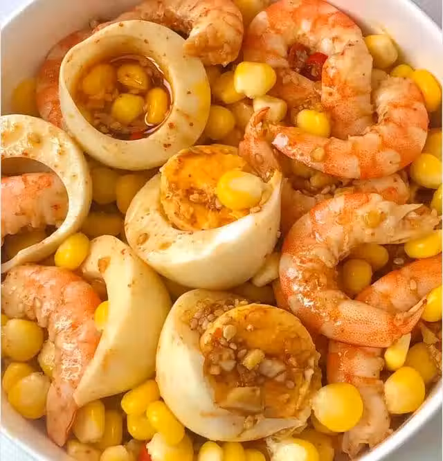1.把三個雞蛋煮熟剝殼,切成兩半,蝦熟後去外殼,再準備一小勺熟的玉米粒,全部準備好後放入一個碗中。
