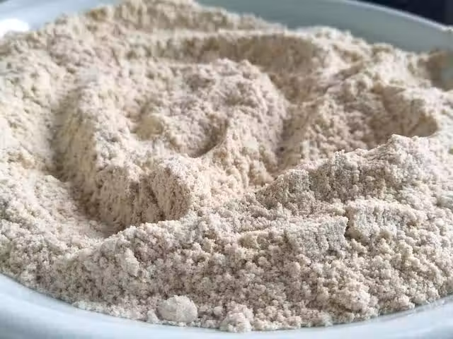 5、家中有破壁機的最好,放點核桃仁,再把黑芝麻放進去,速度調成10,旋轉打成碎末,只要8-10秒就夠了,過度會出油,接著再分2次,把麵粉加進去,攪拌均勻即可。