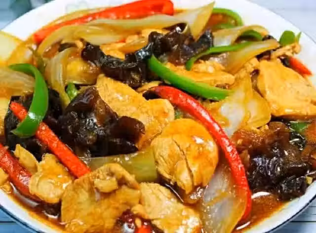 5.另起鍋倒油,把蒜片炒香,放入洋蔥、木耳大火煸炒片刻,再放入青紅椒絲炒至斷生,最後把雞胸肉倒進來,加生抽、蚝油、食鹽、白糖翻炒入味後出鍋。這道菜雞胸肉要提前腌制,這樣吃起來才會更加滑嫩。