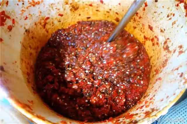 12.將打好的辣椒醬帶回家,舀入家裡洗凈晾乾的大罈子裡。舀幾勺進去,就要用長勺子使勁將罈子裡的攪拌均勻。最後,不要將罈子裝滿,要留段距離,因為豆瓣醬發酵了還會翻泡,這時裝滿了,到時會溢出來。