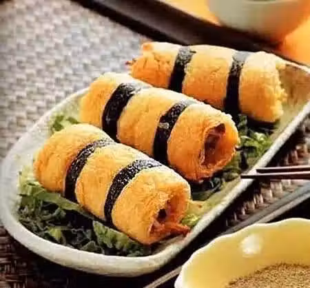 4、紫菜條面端沾少許麵糊,裹住豆包卷(每卷裹兩條紫菜),入油鍋小火煎熟即可。