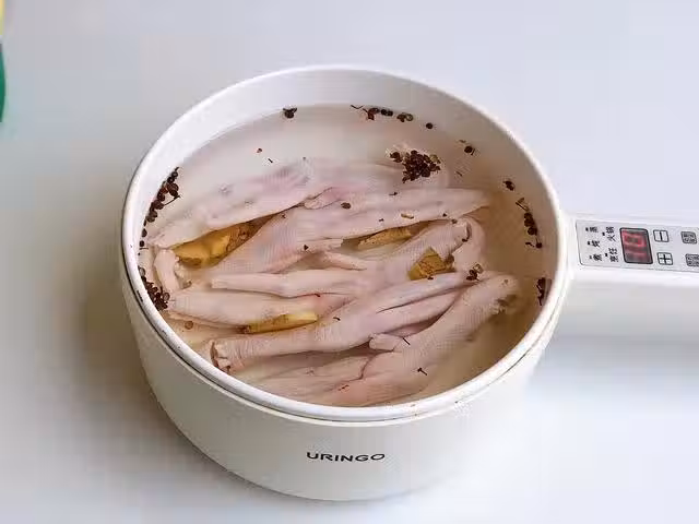 將鴨爪冷水下鍋,加入適量花椒、生薑和料酒,中小火煮沸後,煮2分鐘左右,將表面浮沫去除乾淨。然後把焯燙好的鴨爪再放入水龍頭沖洗乾淨,這樣能去掉鴨腳的異味。