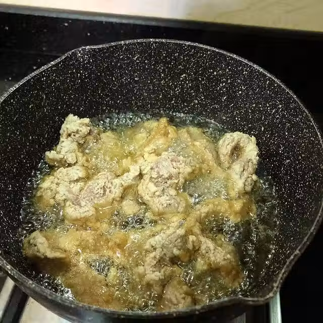 炸制表面略微金黃酥脆即可(怎麼判斷炸酥脆了,炸定型,我們翻動醋肉的時候,能明顯聽到沙沙的聲音,而且醋肉表面有蓬鬆狀態)炸制好的醋肉,撈起來控油一下即可。
