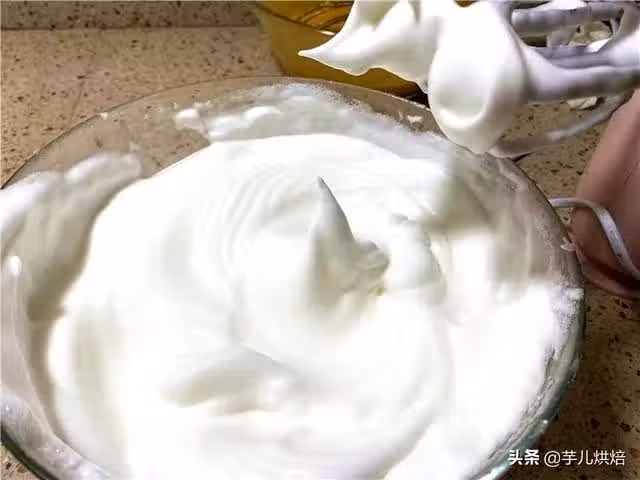 7. 取1/3蛋白糊入蛋黃糊中翻拌均勻。這時,提前將電飯煲插上電源,按下煮飯鍵,預熱3分鐘。