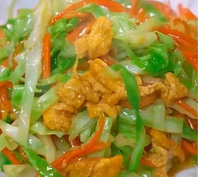 3.鍋中倒油爆香蒜末,放入包菜、胡蘿蔔絲炒至斷生,放入雞蛋,加生抽、蚝油、食鹽、雞精翻炒均勻出鍋裝盤。
