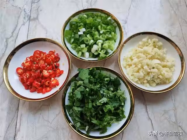 5.把小米辣和小蔥都切成薄一些的片,香菜切末,大蒜切末。