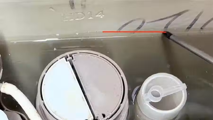 這里大家注意看原來的水位線,在這里由於長時間的使用,有很明顯的痕跡,通過調節,水位已經明顯的上來了,把以前的痕跡完全覆蓋了,水位高出了差不多一到兩公分的樣子。我們水箱裡的水多了,沖馬桶的水自然力就大了,這個時候一次就能把它沖干凈了。大家看我們這樣沖水沖的水多,而且沖勁很足。