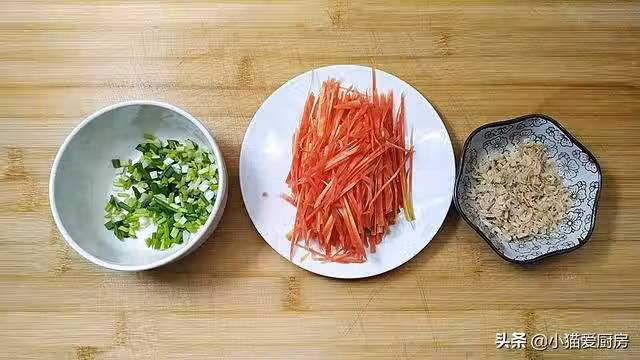 【步驟四】:雞蛋攪散後,依次放入紫菜、胡蘿蔔絲、香蔥末、1勺麵粉,再把鹽和胡椒麵放裡邊。