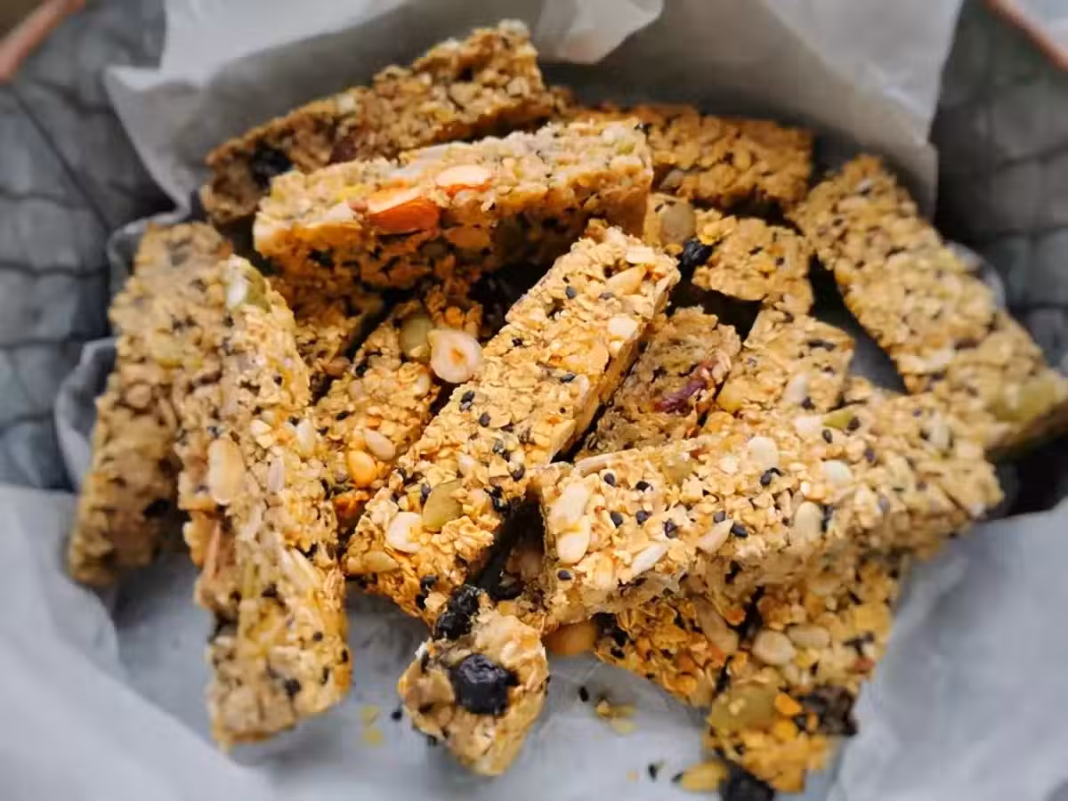 2、烤能量棒的時候,像葡萄乾、蔓越莓幹、黑加侖這樣的果乾盡量不要鋪在表面,容易烤糊,或者提前用朗姆酒浸泡一下。