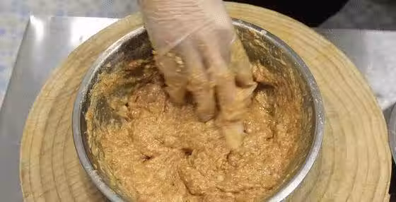 肉餡攪拌好以後倒入香菇粒,用手把香菇粒和肉餡抓勻攪拌 ,攪拌到香菇粒和肉餡充分融合,一盆香噴噴的餃子餡就打好了,蓋上保鮮膜備用。
