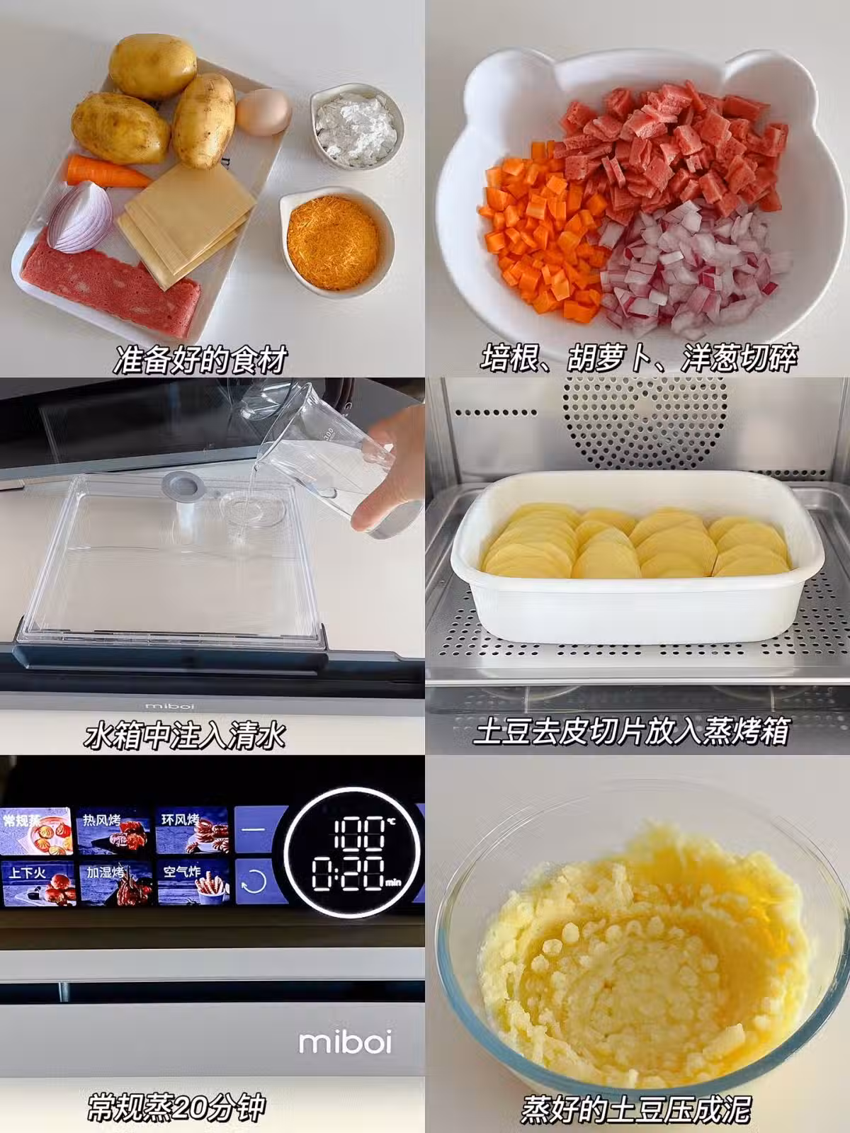 1️⃣培根、胡蘿蔔、洋蔥切碎,土豆去皮切片,送入蒸烤箱蒸15分鐘