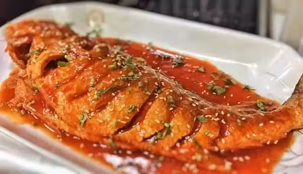 13)熬好的湯汁淋在盤中的魚身上,撒上蔥絲和泡紅辣椒絲即成