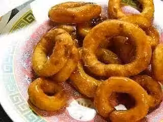 4)把鍋開熱,加入油,把番薯圈炸成金黃色勞起 趁熱灑上細紗糖便可