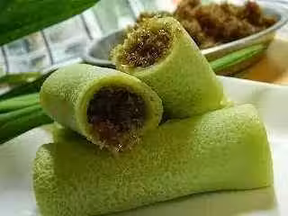 4)把稍微金黃色的皮往下,表層放入適量的餡料,像春卷一樣包起即可。
