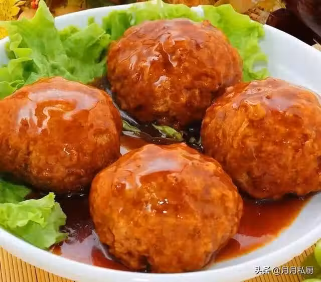 4.鍋里留油,蔥蒜爆香,加入一碗清水,再加入生抽、老抽,煮開後下入肉丸,中小火煮10分鐘,加水澱粉勾芡收汁,裝盤下面用綠葉菜點綴。