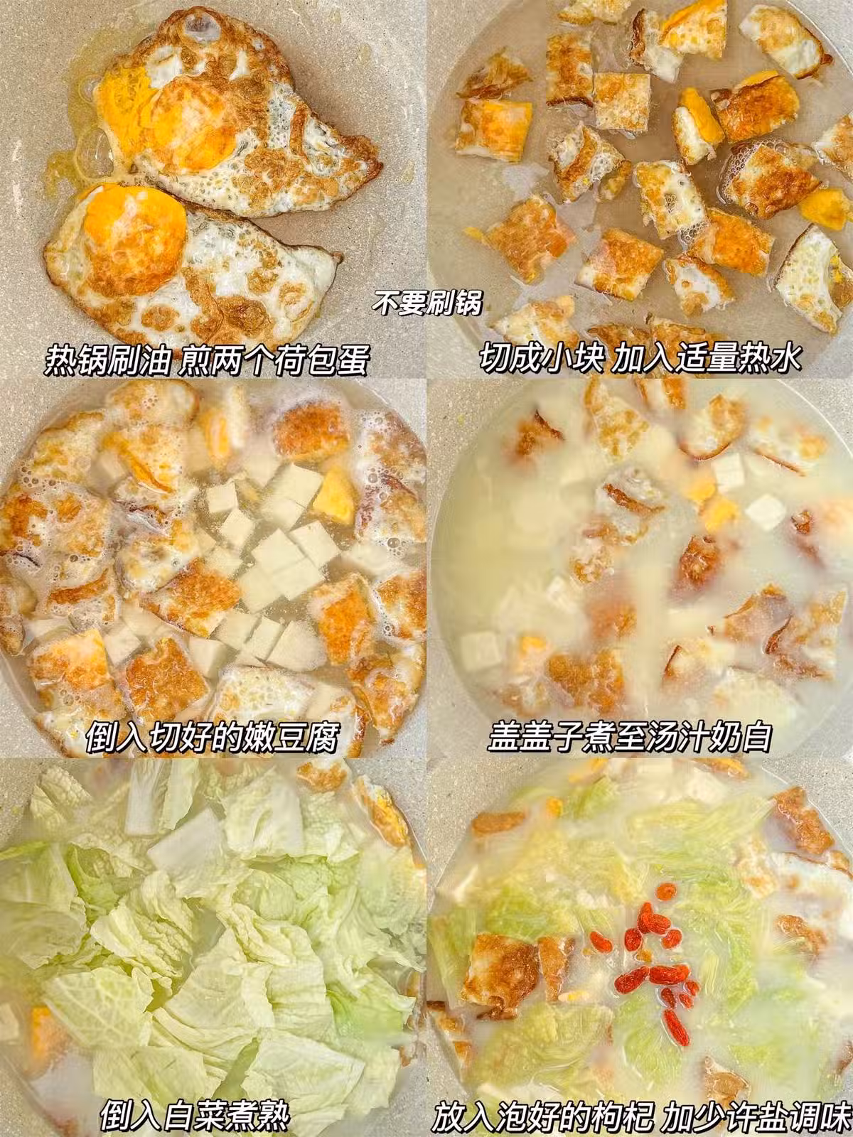 :煎兩個荷包蛋,切成小塊,加入適量熱水 🦄🦄:準備一塊嫩豆腐切成小塊,放入鍋里,蓋上蓋子煮至湯汁奶白 🦄🦄🦄:將白菜葉切成小段煮熟 🦄🦄🦄🦄:放入泡好的枸杞,加入少量鹽,雞精調味