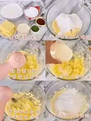 3⃣️過篩低筋麵粉,用刮刀翻拌均勻,分成三等份,一份加入抹茶粉拌勻,一份加入可可粉拌勻,三個口味就分好啦