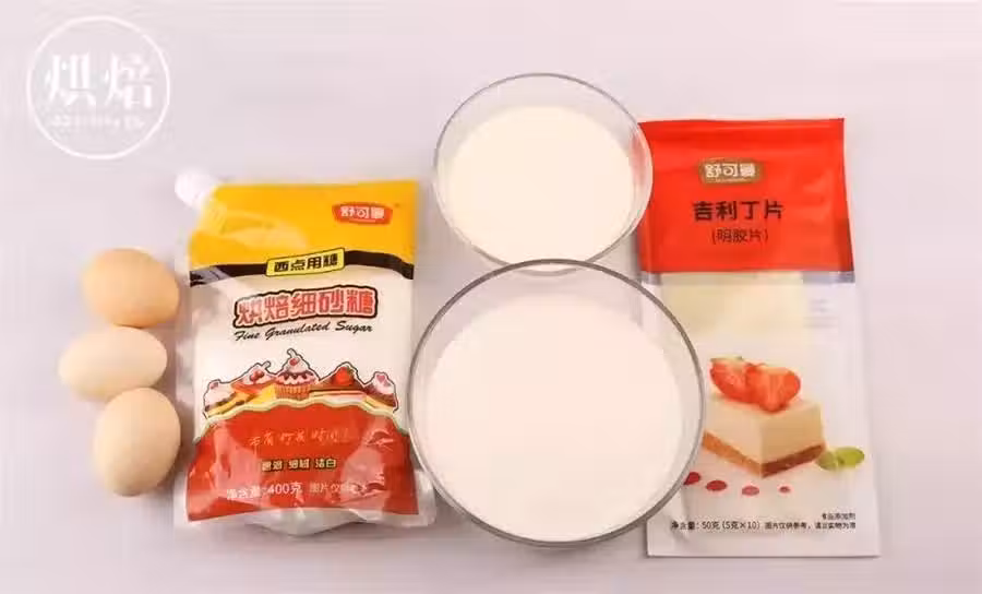 牛奶 330g 、淡奶油 130g 、烘焙細砂糖 60g、 吉利丁片 10g、 蛋黃 3個