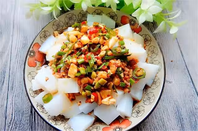 將涼粉切成絲狀,配以酸辣的調料,製成一道爽口開胃的涼菜。將涼粉切成適當大小,加入蒜末、醋、辣椒油、醬油等調味料,拌勻即可。這道菜酸辣可口,帶來一陣清涼的感覺,消暑解膩。