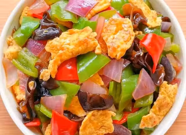 食材準備:紅椒,木耳,洋蔥,青椒,雞蛋,醬油,蚝油,澱粉等。