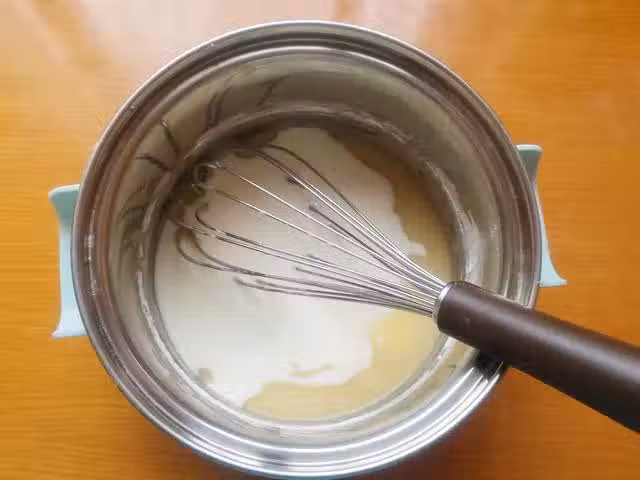 4、接著把蛋黃和蛋清分離(蛋清一定要裝在無水無油的盆子內),然後把蛋黃倒入麵糊里,混合均勻,混合好後蓋上蓋子或者保鮮膜待用。