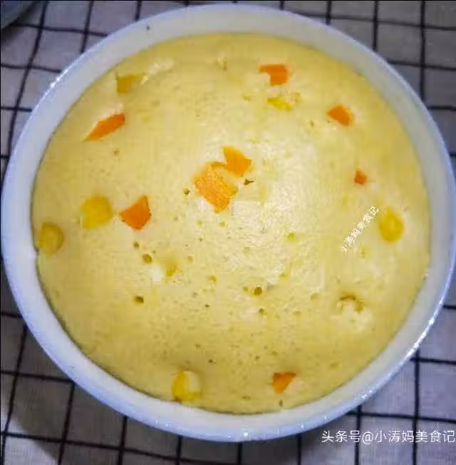 2、把玉米雞蛋糊倒入碗里的時侯,最多可以放七分滿,太多會溢出來的。