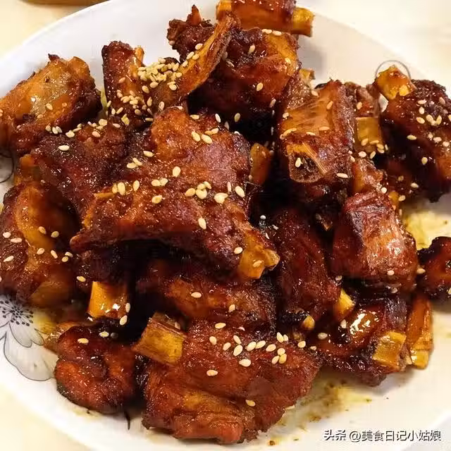 鍋中加油,放入冰糖小火炒至融化,放入排骨翻炒均勻,使排骨裹上糖色。