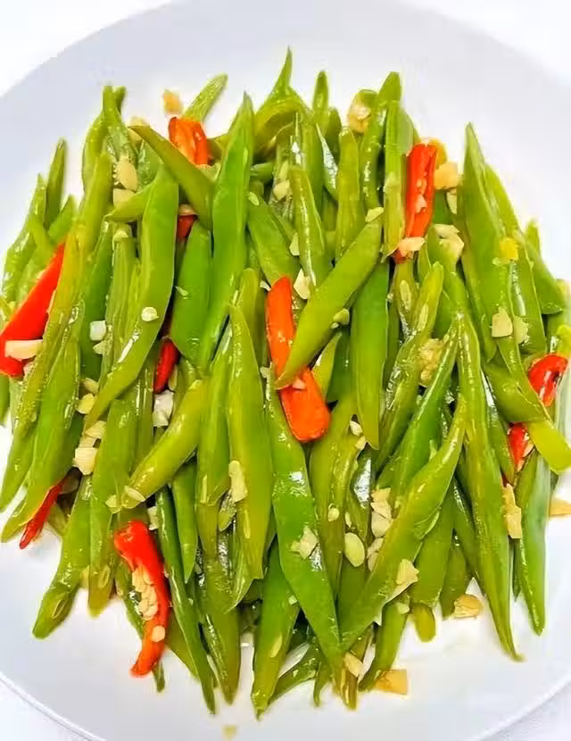 步驟三:鍋中油熱,下入蒜末兒、辣椒炒香,將扁豆角下鍋翻炒均勻,加1勺生抽、少許糖、鹽、半勺醋,大火翻炒均勻即可出鍋。
