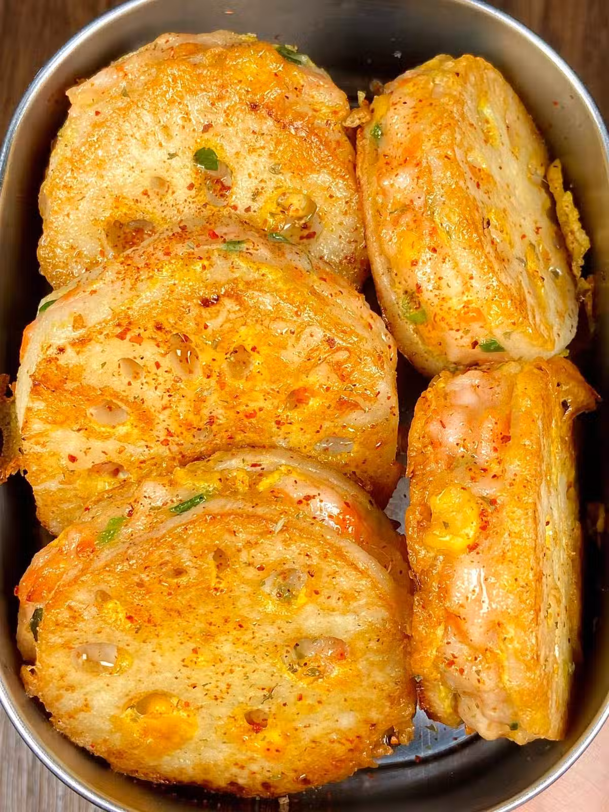 外面焦香焦香的,裡面的蝦滑咬開還會爆汁勒!!外面裹的蛋液煎出來金黃金黃的真的很絕!!出鍋可以撒些辣椒粉,椒鹽粉吃哦!!