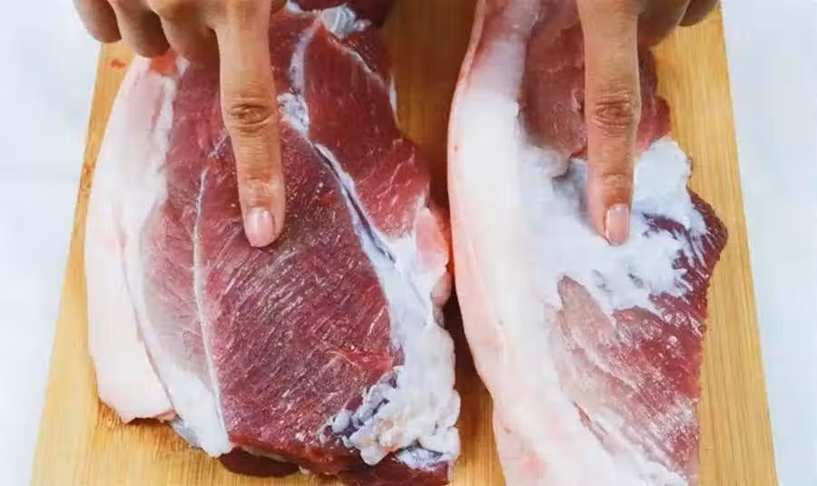 如果我們趕早去買肉的話,肉攤上肯定還有很多的肉,多的話我們還有很大的一個選擇空間,但是也不容易讓人無法分辨出好壞。那麼這個時候我們先鎖定幾個目標,就是說自己可能要買的肉,然後再來仔細看一下豬肉的紋路,如果豬肉上的紋路清晰,看上去也很規整,那麼這樣的豬肉就還是新鮮的。反之豬肉的紋路模糊不清,而紋路看上去不規則,說明這樣的豬肉已經有了糜爛或者水分嚴重流失的情況,這樣的豬肉我們就不要買了。