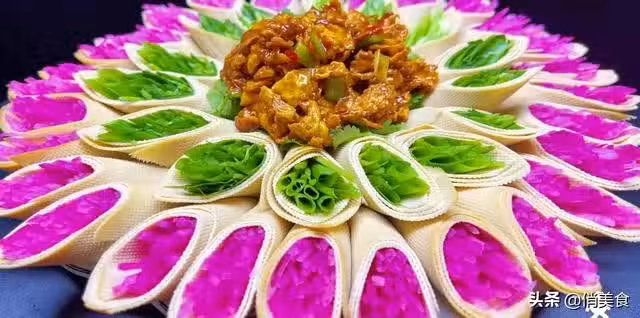 2、一張千張上面鋪上蘿蔔絲,從一頭捲起卷得緊實些,最後斜著60度切成大小相同的段。