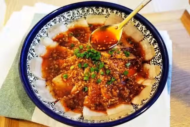 適用菜肴:此配方的味汁可以直接淋入裝盤的雞絲、肚絲、拌白肉等涼菜中,也可拌入原料然後裝盤。蒜泥味汁一般多用於白煮類涼菜,所以不用醬油,其口味特點是蒜香濃郁,咸鮮開胃。