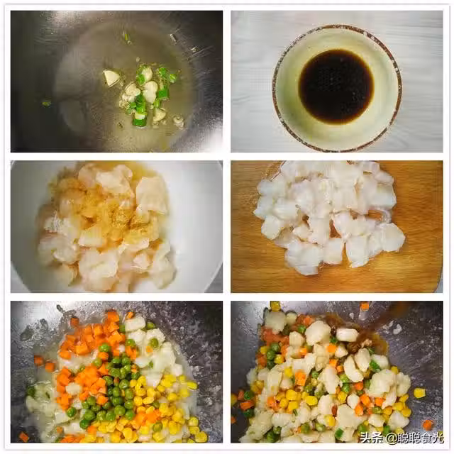 倒入之前準備好的玉米,豌豆,胡蘿蔔丁等配菜。