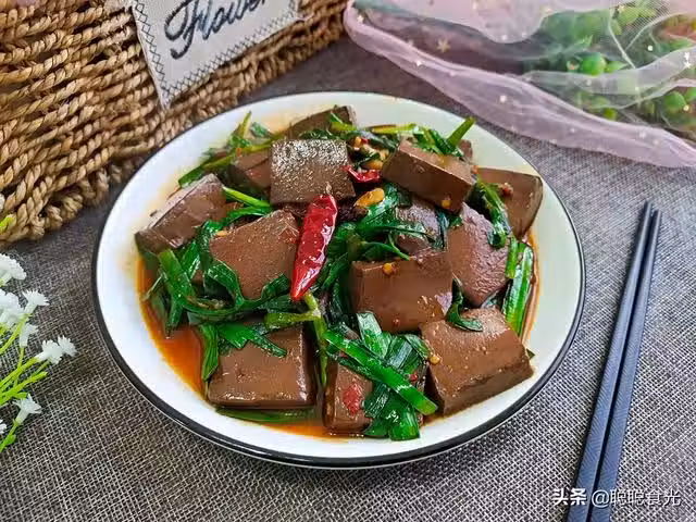【食材】鴨血,韭菜,姜,蒜,辣椒,豆瓣醬,生抽,料酒,胡椒粉,花椒粉,糖,油,鹽