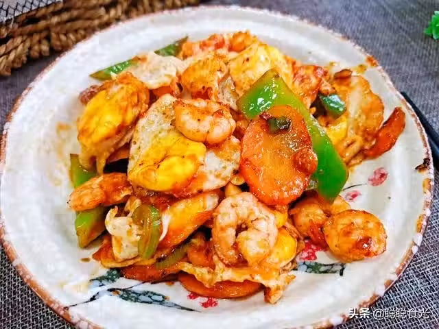 【食材】大蝦,鵪鶉蛋,胡蘿蔔,青椒,大蒜,大蔥,蚝油,番茄醬,鹽,糖