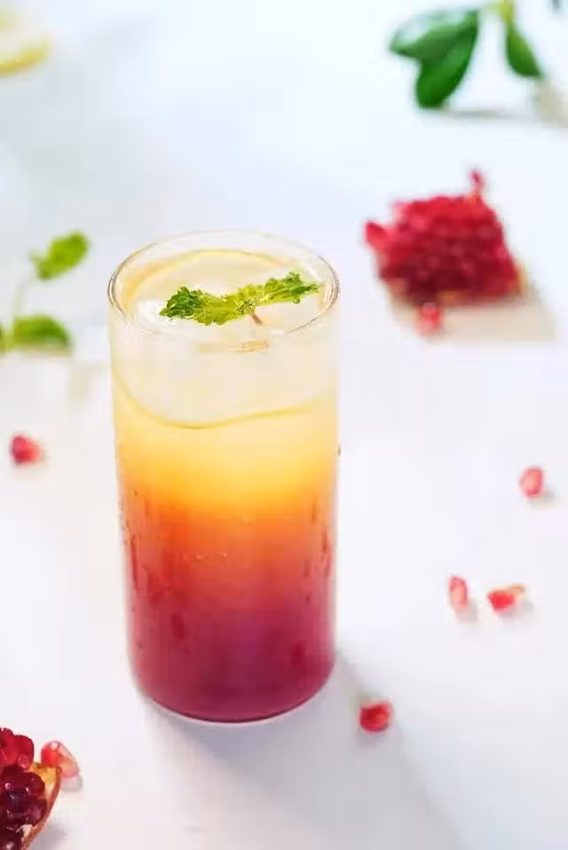 石榴汁倒入杯底,放入冰塊,順著冰塊緩緩地倒入橙汁,最後倒入蘇打水。放上檸檬片、薄荷做裝飾,攪拌均勻,搞定。