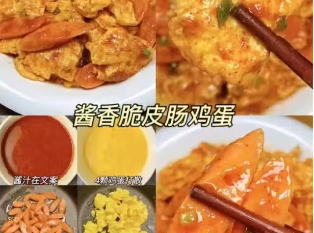 調好醬汁:2勺生抽、1勺醋、1勺蚝油、半勺白糖、1勺辣椒粉、1勺澱粉、半碗水備用。4個雞蛋打散,脆皮腸翻炒一下,雞蛋炒熟,倒入脆皮腸和醬汁,翻炒均勻收汁,撒上蔥花就可以開吃啦