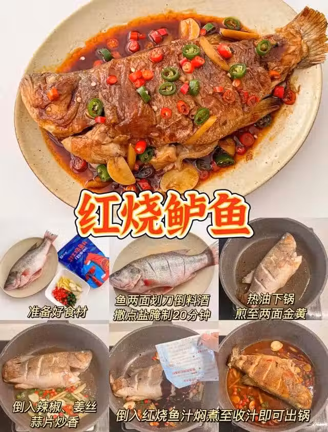 做法:魚清洗乾淨,兩面劃刀,撒少許鹽、料酒和薑絲腌制30分鐘。鍋中油加熱,放入魚煎至兩面金黃,放入辣椒姜蒜片炒香,最後倒入紅燒汁和少許清水燜煮至收汁即可。