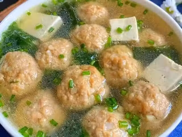 (4)燒開後放入準備好的肉丸煮至熟透,加入豆腐、生抽、食鹽輕微攪拌煮開3分鐘左右,時間到後撒上蔥花即可。