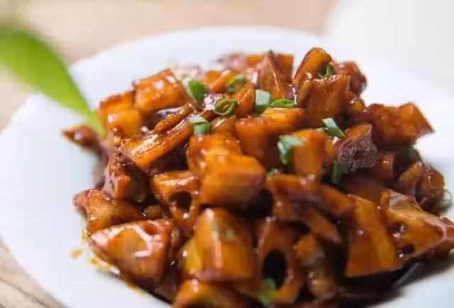 【製作步驟】蓮藕去皮切丁;開水汆燙後撈出備用;準備小碗加老抽,白醋,白糖,雞精,食鹽,調好糖醋汁;準備一小碗澱粉水備用;油熱倒入藕丁翻炒至輕微變色;倒入糖醋汁,再加入水澱粉,炒至湯汁粘稠,最後出鍋加入蔥花即可。