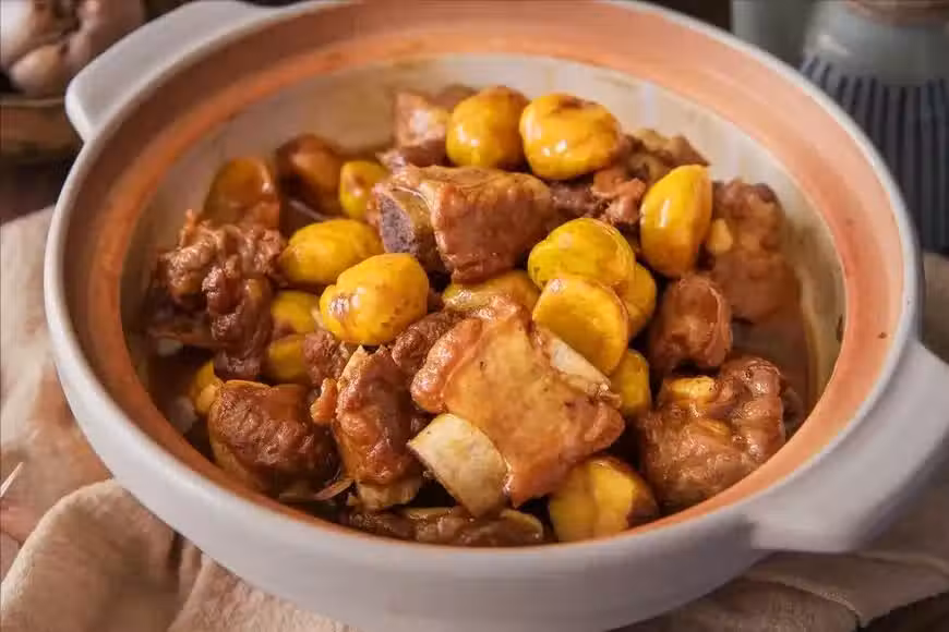 食材:板栗、排骨、蔥姜、八角、桂皮、鹽、白糖、雞精、醬油、料酒、食用油