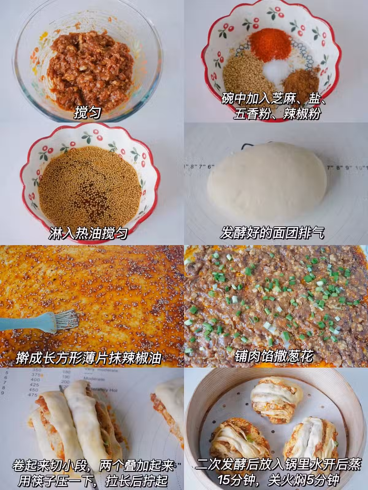 4️⃣發酵好的麵糰取出揉勻,擀成長方形,刷辣椒油,鋪肉餡撒蔥花