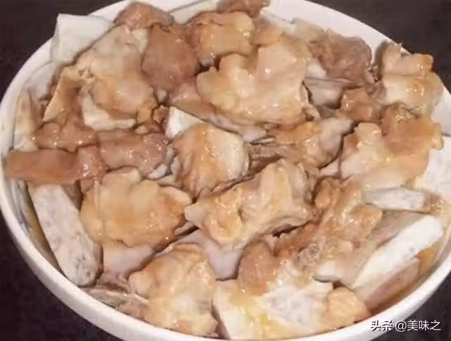 2、排骨用生抽,生粉,糖,一點油拌勻。