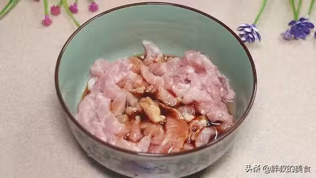 ⑤:起鍋燒油,先把腌制好的肉絲放進來翻炒,炒至變色後撈出備用。