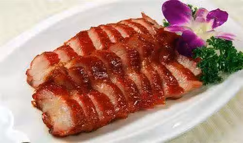 4.在豬肉表面刷兩遍腌肉汁,放入烤箱中層烘烤20分鐘。取出烤盤,用夾子給豬肉翻個面,再刷兩遍腌肉汁,繼續烘烤20分鐘,直到表皮焦黃上色。
