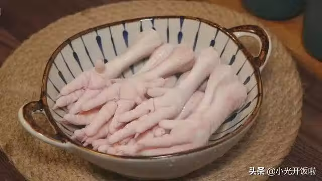 ③:處理好的雞爪記住一定要涼水下鍋,加入去腥三件套(蔥結、薑片、料酒),然後開大火給它煮10分鐘,10分鐘後在撈出來清洗掉油脂和浮沫,這樣才能夠徹底出去腥味。