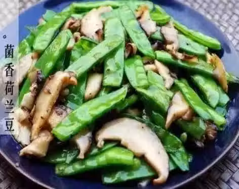 4、待香菇半熟,倒入荷蘭豆,調味:胡椒,糖,鹽,味全高鮮。炒至荷蘭豆熟即可起鍋裝盤 |荷蘭豆容易熟,也不太容易入味,如果拿不準熟沒熟,那就夾一個嘗一嘗咯。