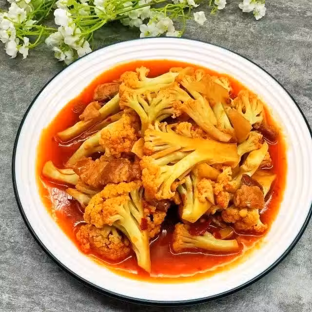 3.倒入蔥姜蒜爆香後,根據自己口味調入醬油、花椒水和白糖翻炒;花菜掰成小瓣後倒入鍋中大火爆炒;可加入少許熱水;倒入少許鹽、醋調味;